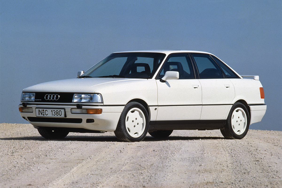 Autant compacte que pratique au quotidien, mais aussi pas trop chère, la « petite » 80 est un best-seller pour Audi, qui parvient à séduire un large public de conquête. Pas assez au goût de Piëch qui va dédoubler l’offre en lançant en 1986 la 3ème mouture « B3 », sous les noms officiels d’Audi 80 et Audi 90. Derrière une carrosserie toute en rondeurs, incroyablement bien profilée, se cache en fait une seule et même voiture. Si la 80 drague une clientèle moins argentée avec ses 4 cylindres essence et diesel raisonnables, la « 90 » se réserve au contraire les finitions hautes et les plus gros moteurs, dont deux 5 cylindres en ligne (2.0 de 115 pour la version « E » économique et 2.2 de 136 ch). Bien sûr, d’emblée, la transmission intégrale quattro est disponible en option. Pour soutenir cette montée en gamme, la 90 voit l’arrivée, dès 1988, d’un inédit et brillant 2.0 20 soupapes de 160 ch (poussé ensuite à 170 ch), doté d’office de la transmission quattro. Une vraie « licorne » sur le marché des petites berlines (4m39), capable d’atteindre sans sourciller les 215 km/h ! En 1991, Audi va enfoncer le clou à travers une « nouvelle 80 » (le matricule « 90 » disparaît pour plus de cohérence). Si elle se pose dans la continuité de sa devancière, faisant presque penser à un simple restylage, cette Audi 80 « B4 » plus cossue, est pourtant nouvelle à bien des égards. Et voit ses ambitions sérieusement revues à la hausse en gagnant, dès 1992, une inédite déclinaison break saluée par le public, sans parler de l’introduction des sobres et performantes TDI.